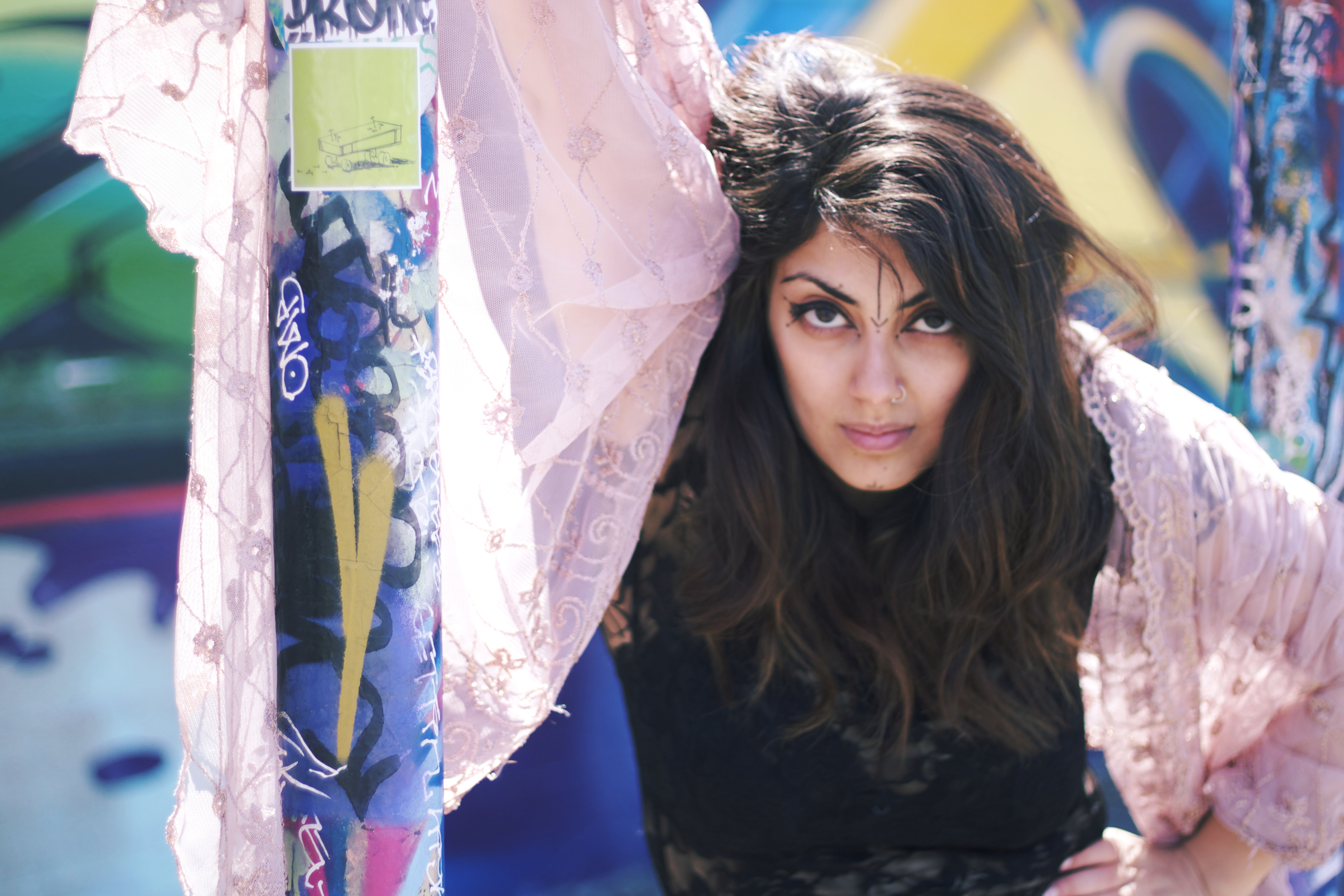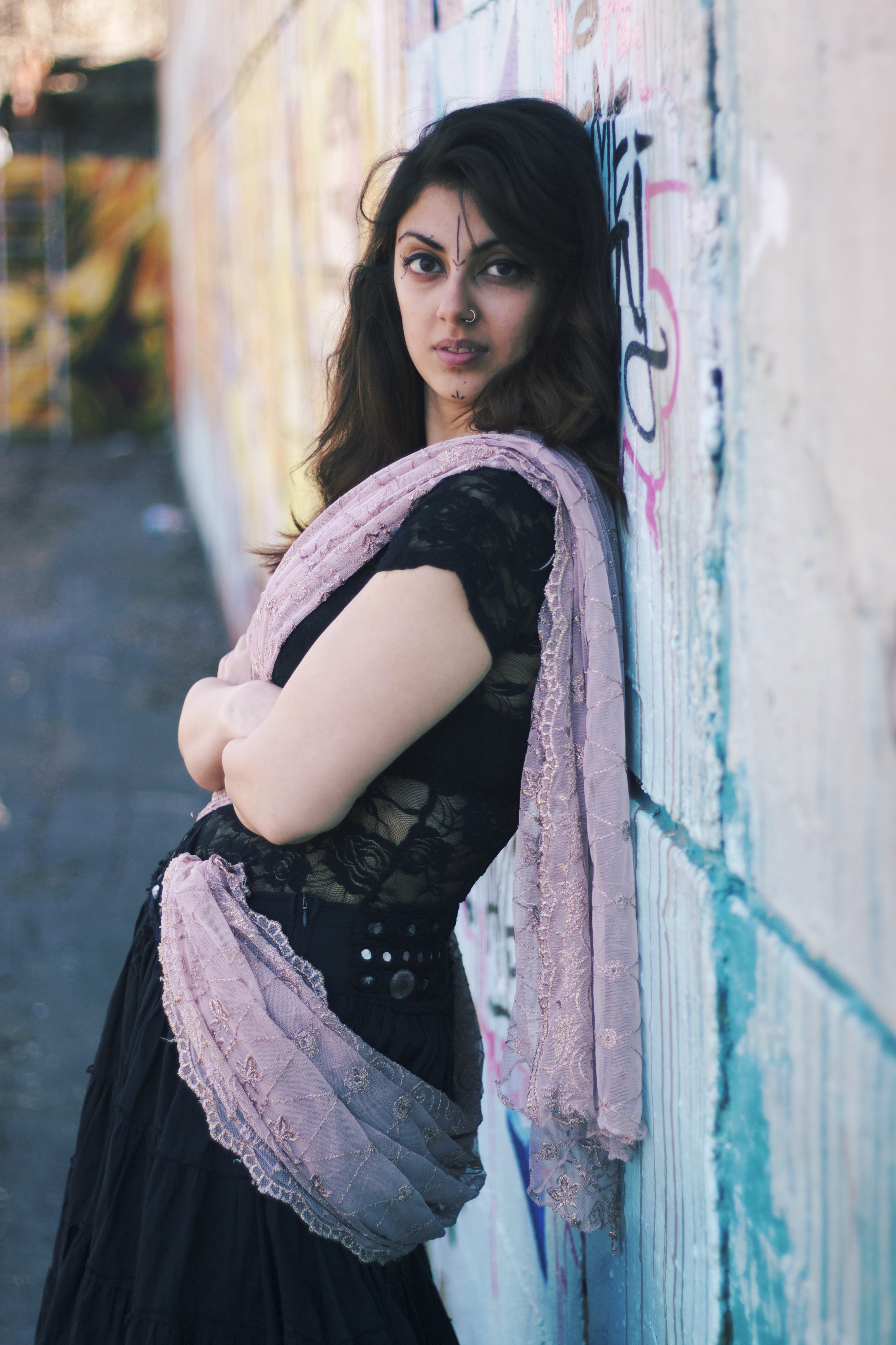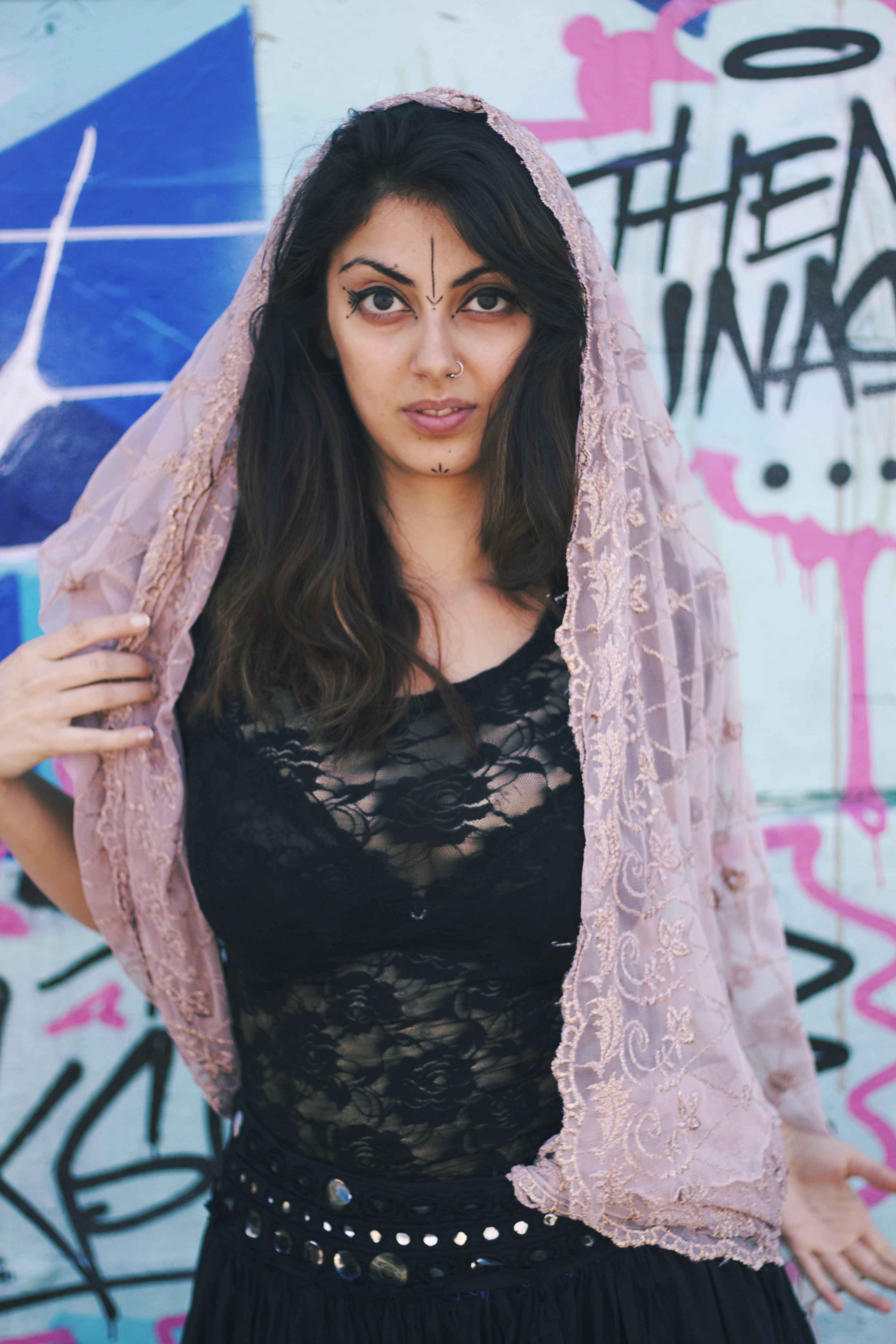 Thanks to Maria for providing me with this interesting history of her tribal makeup. This shoot was a great contrast between the old and the new, tradition and modernity. By embracing both a fantastic effect was created, with the softness of “chunni”, skirt, and lace top against the strength of the tribal makeup and the modern graffiti wall.