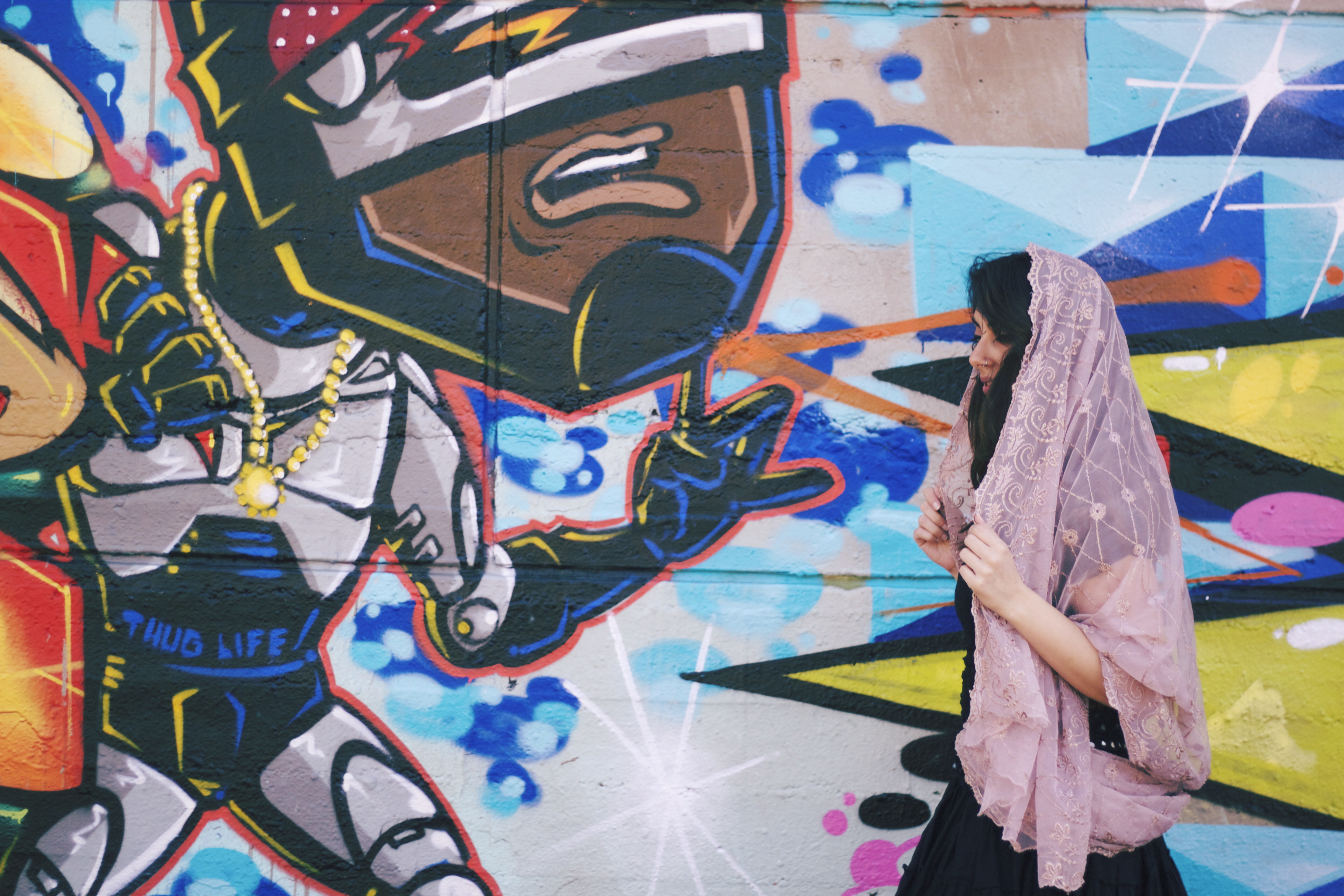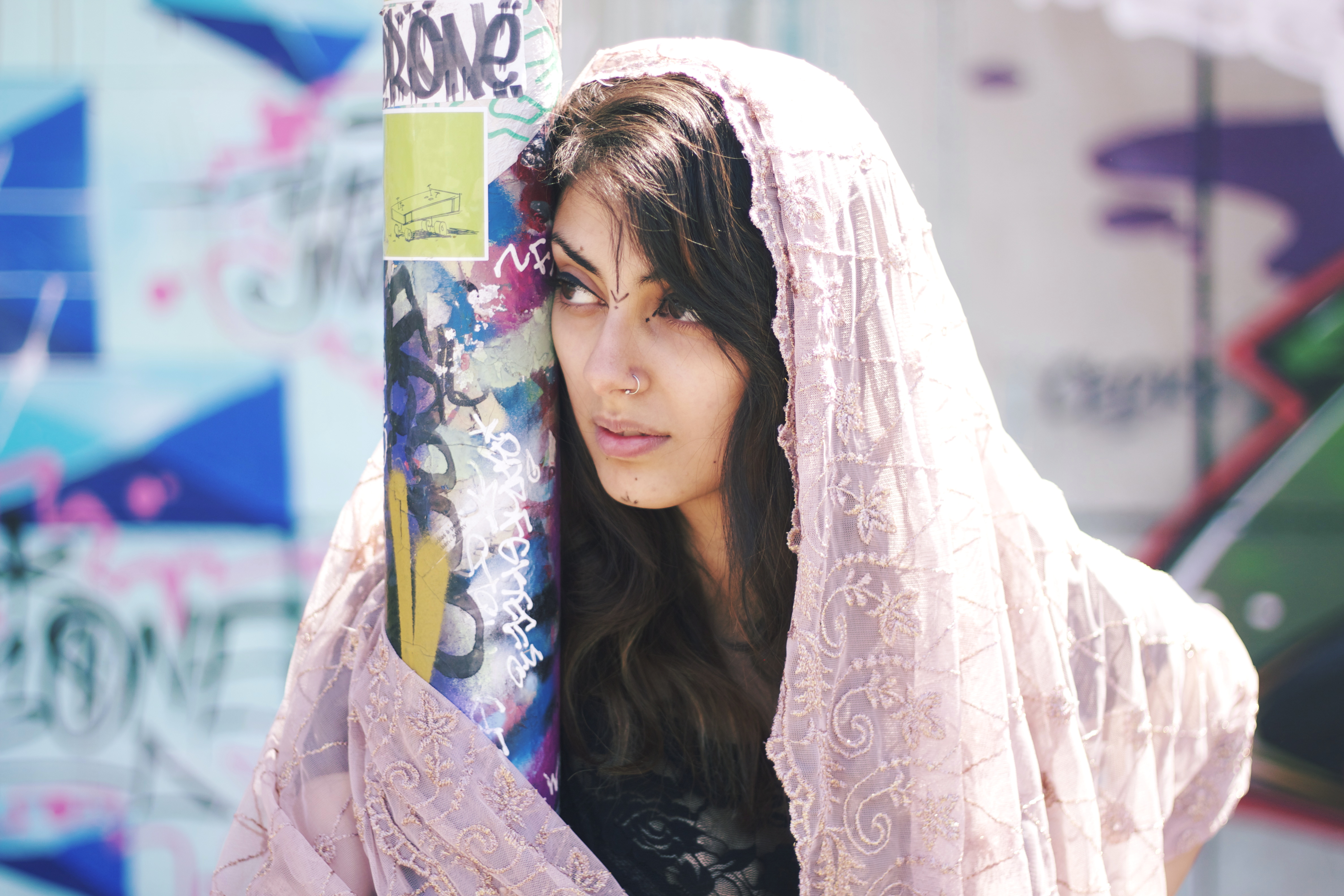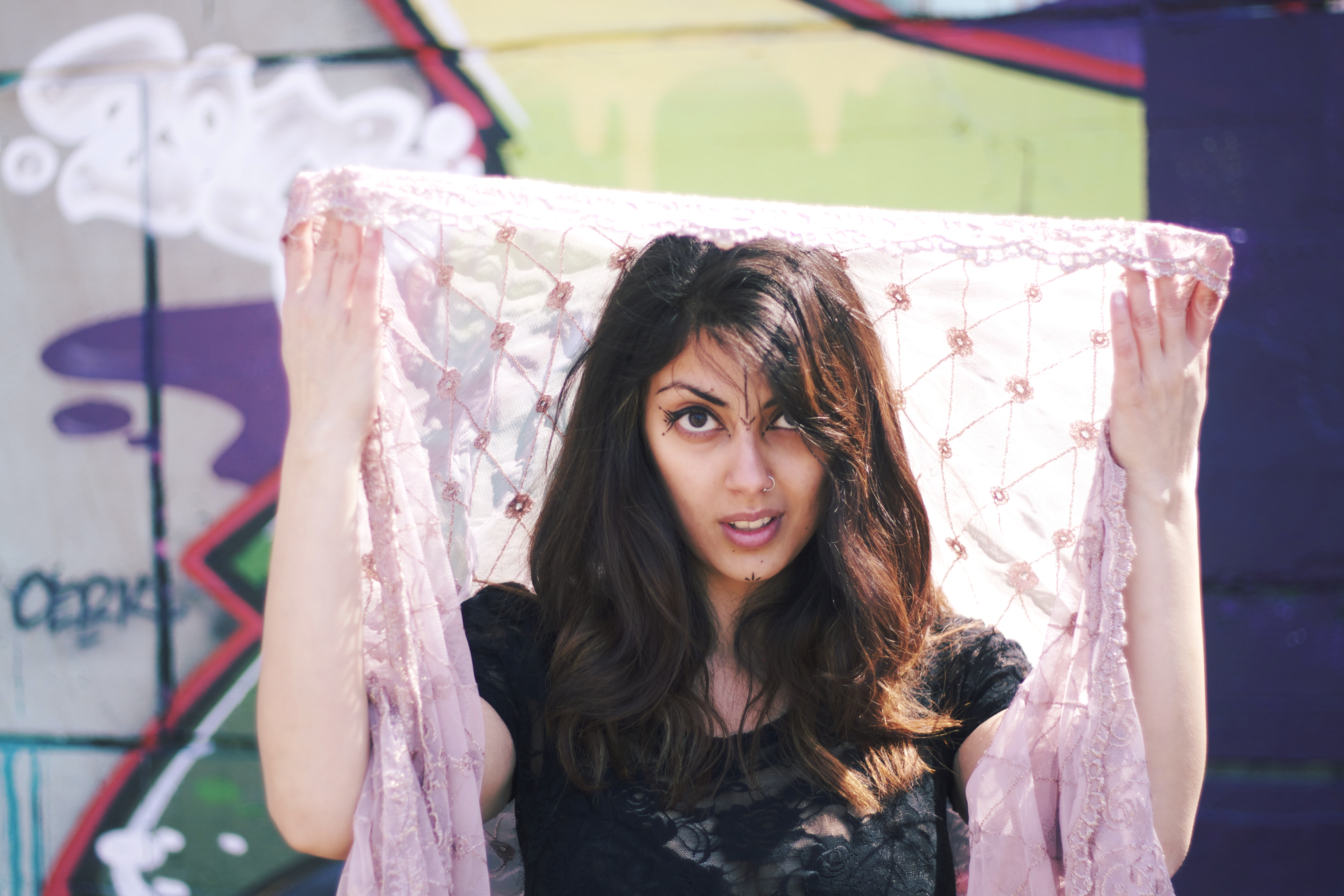 Thanks to Maria for providing me with this interesting history of her tribal makeup. This shoot was a great contrast between the old and the new, tradition and modernity. By embracing both a fantastic effect was created, with the softness of “chunni”, skirt, and lace top against the strength of the tribal makeup and the modern graffiti wall.